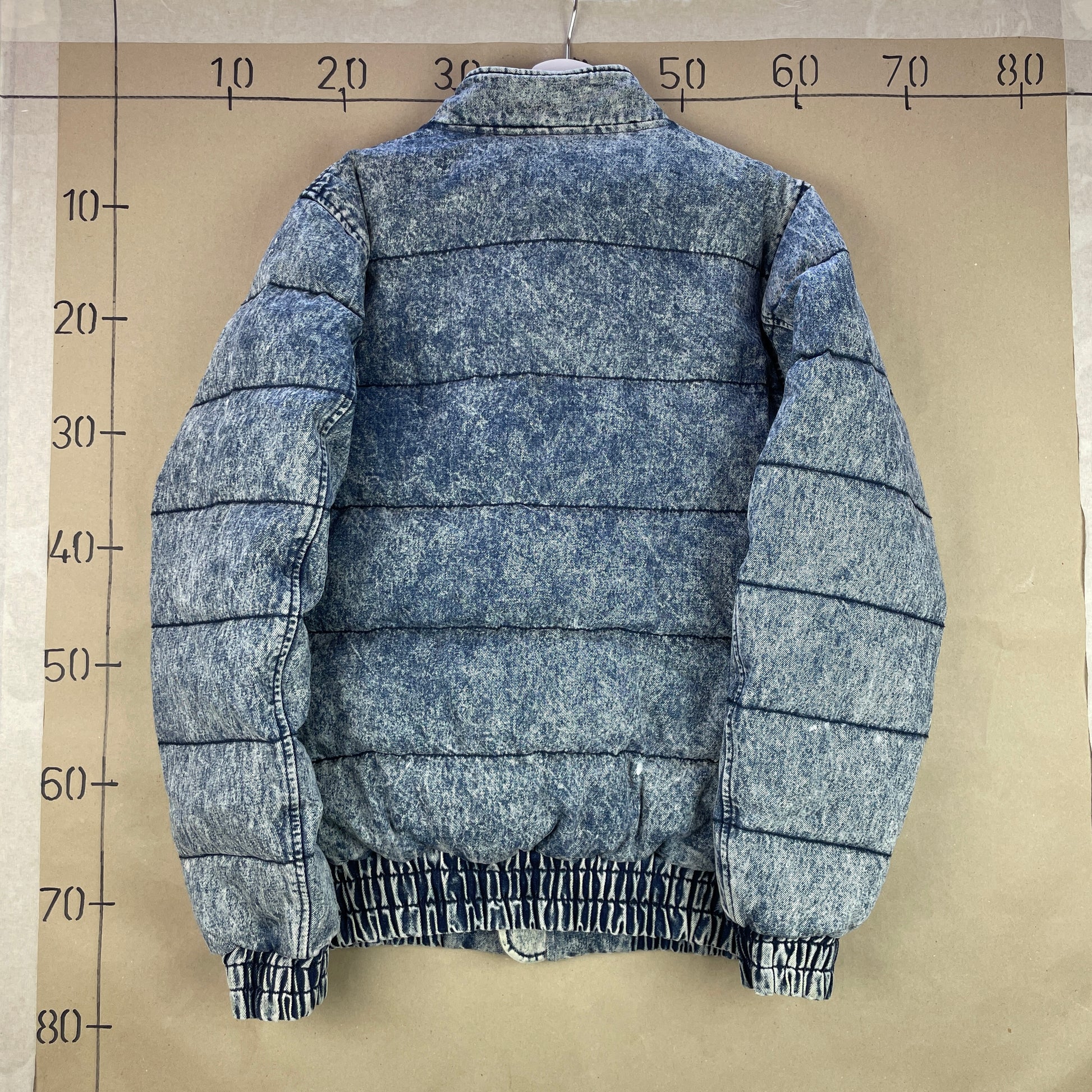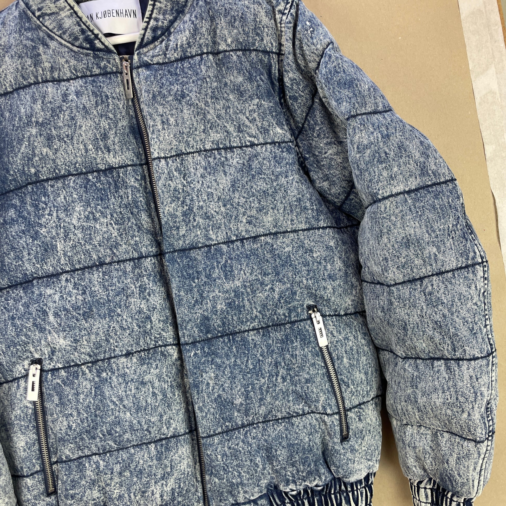 Vintage Han Kjøbenhavn Jakke, Acid Wash Puffer Jacket, Retro Denim Look Coat, 2010s Streetwear Outerwear, Rare Scandinavian Street Style, Quilted Vintage Jacket, Bold Retro Fashion, Han Kjøbenhavn Collector’s Piece, Vintage Inspired Puffer, Urban Cold Weather Jacket, Statement Streetwear, Blue Washed Puffer Coat, Nordic Street Fashion