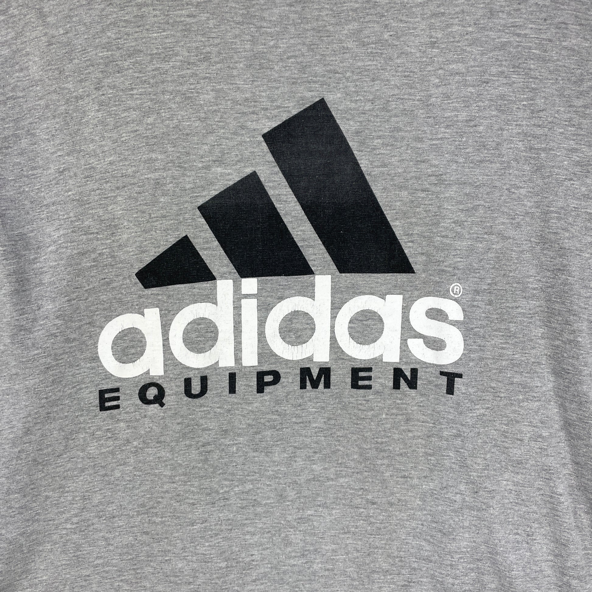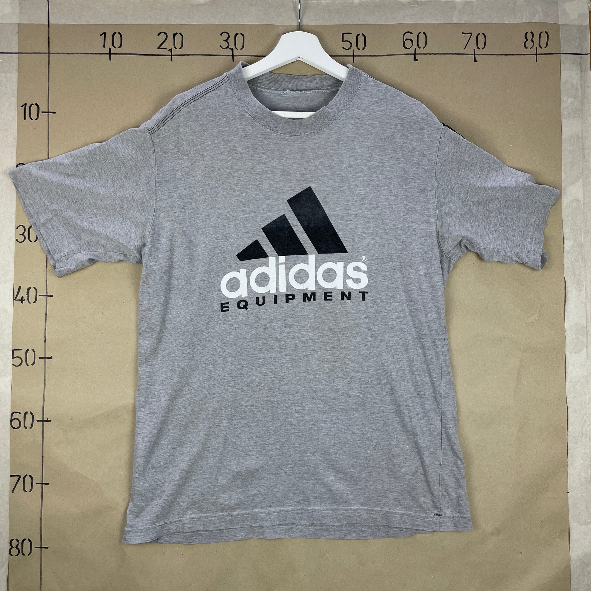 Adidas Vintage T-Shirt, Grå Sportstrøje, 90er Stil, Adidas Equipment Patch, Klassisk Sportslogo, Retro Sporty Look, Adidas Originals, Atletisk Streetwear, Unisex T-Shirt, Casual Vintage Style, Amerikansk Sportstrøje, Oversize Fit, Oldschool Adidas, Grå Logo Tee, Minimalistisk Sportsstil, Classic Trefoil Look, Komfortabel T-Shirt, Retro Athletic Wear, Everyday Streetwear Tee, Adidas 90s Vibes