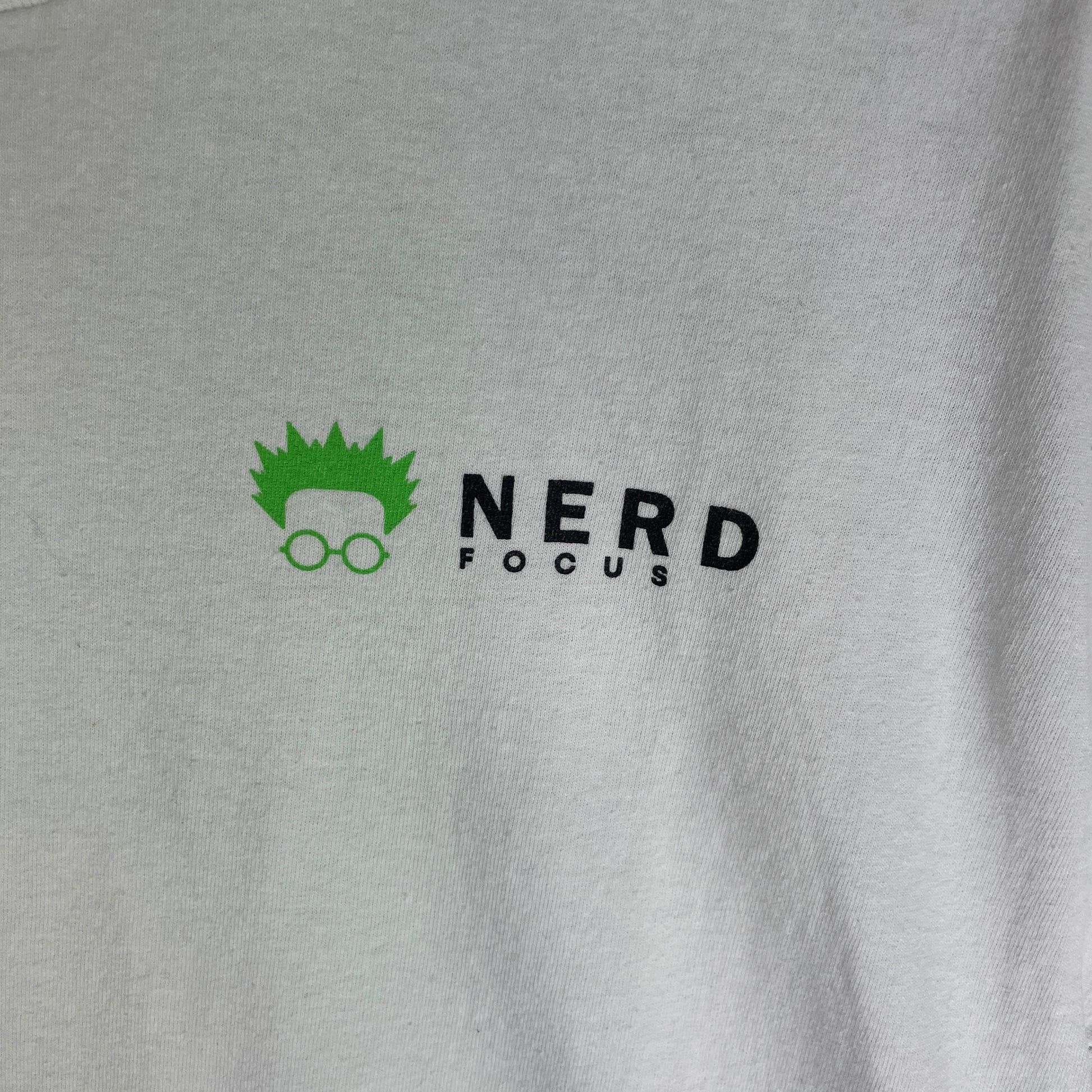 Nerd Focus, Vintage T-Shirt, Grafisk Print, Brystlogo, Rygprint, Minimal Front, Statement Back, Streetwear, Hvid T-Shirt