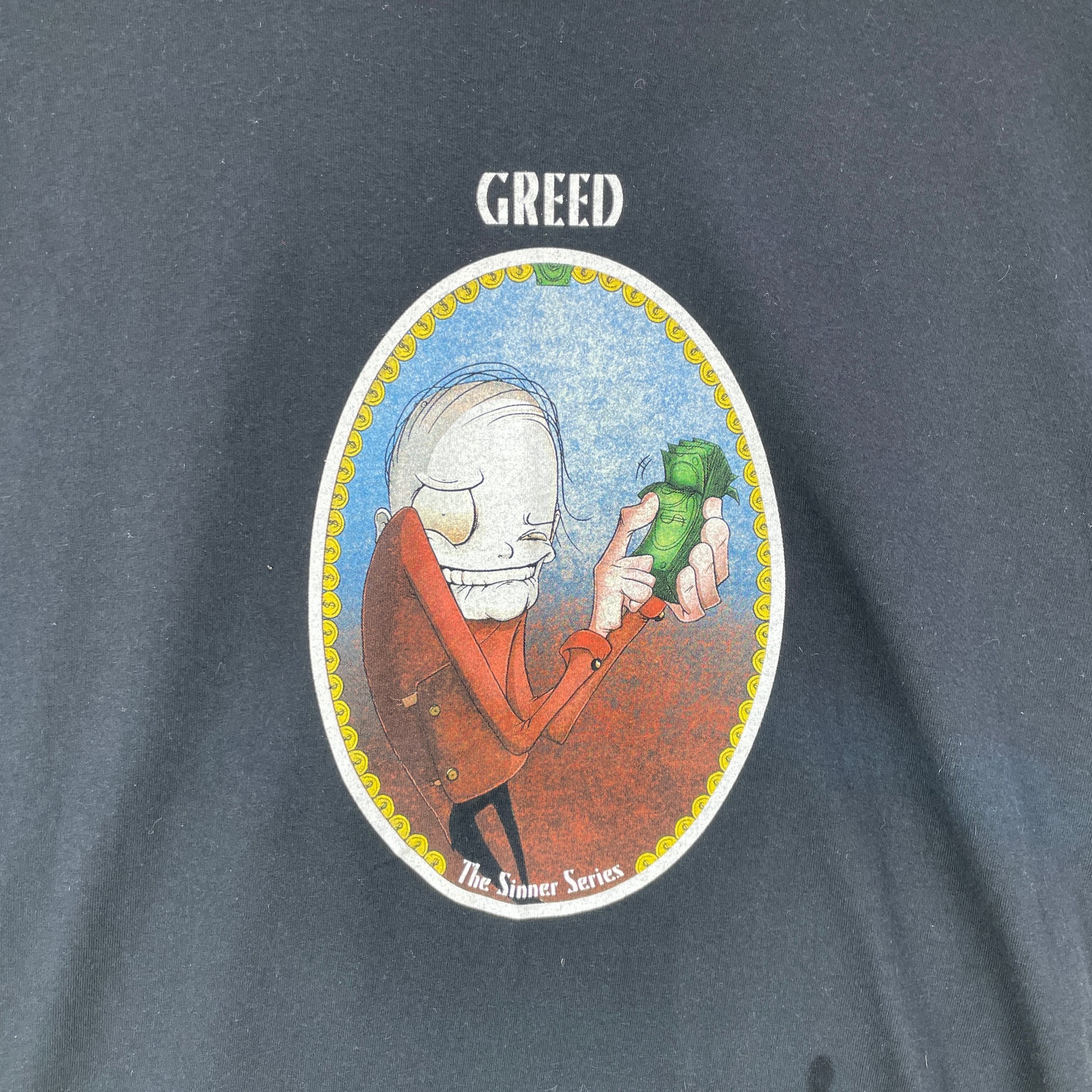 Amager Bryghus T-Shirt, The Sinner Series, Greed Print, Bryggeri Merchandise, Sjælden T-Shirt, Sort T-Shirt, Ølentusiast Tøj, Vintage Look, Gildan Heavy Cotton, 100% Bomuld, Farverig Grafik, Illustration Tee, Satirisk Design, Samleobjekt Tøj, Danske Bryggerier, Ølrelateret Tøj, Festival T-Shirt, Unisex Tee, Alternativ Stil, Kreativ Grafik, Humoristisk Print, Medium Størrelse, Statement Tee, Ølmode, Samler Tøj, Retro Bryggeri Design